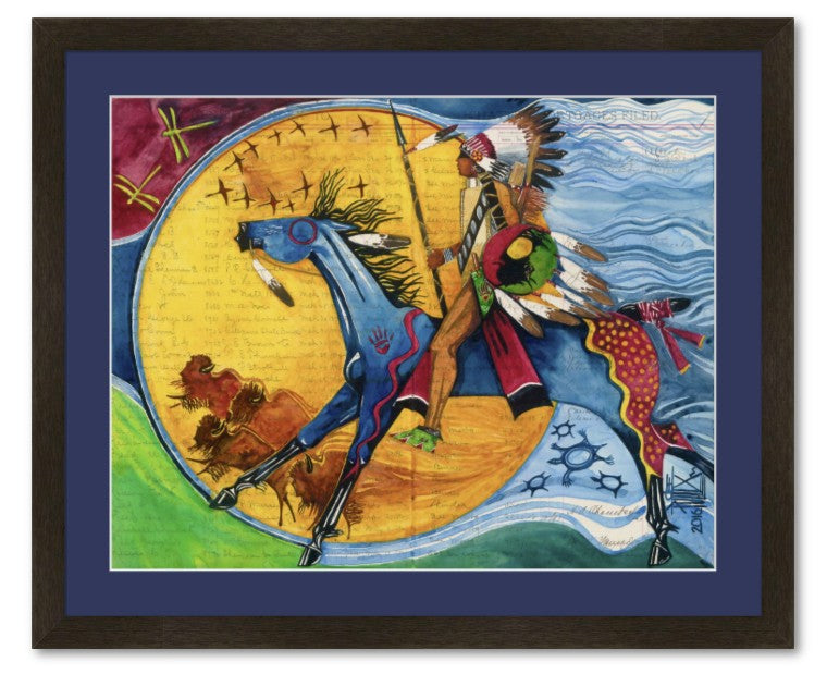 The original watercolor on antique ledger paper from Sheridan County, NE just south of the Pine Ridge, signed with the artist's distinctive signature and dated 2016 is reproduced beautifully in an archival quality giclee' print!
